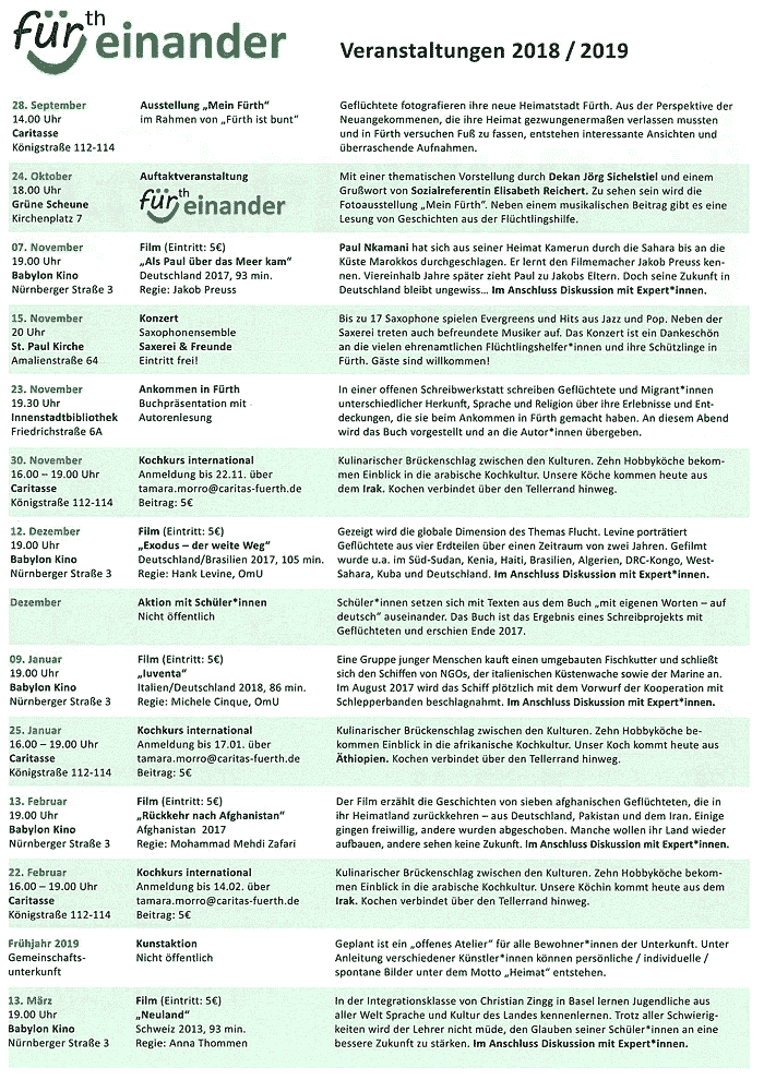 Am 24. Oktober 2018 gründeten das Evangelische Dekanat Fürth, der Caritasverband für die Stadt und den Landkreis Fürth und das Freiwilligenzentrum Fürth die Initiative Für(th)einander mit dem Ziel, für eine offene Stadtgesellschaft einzustehen. Eine große Auftaktveranstaltung war der Beginn einer Reihe von verschiedenen Veranstaltungen.