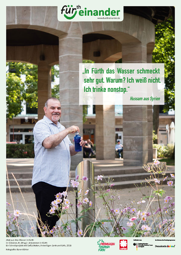 In Fürth das Wasser schmeckt sehr gut. Warum? Ich weiß nicht. Ich trinke nonstop. Mein Opa war in Damaskus Universität Professor Französisch; geboren 1910. Er hat gesagt: „Wenn man eine Stadt mit gut Wirtschaft gefunden hat und das Wasser schmeckt gut, dann gibt es in diese Stadt Juden.“ Und in Damaskus und in Fürth stimmt das.